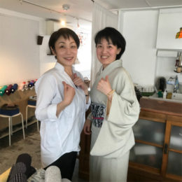 ご紹介が遅れまして、大変申し訳ございません。和裁士の安田裕子さんです。(右)oteshioの着物の展示会では、いつも、参加して頂いています。今回の「あいおもい ・東京展」にも、北海道から私と一緒に在展しています。着物や帯は、どんなに素敵でも、和裁士さんがいなければ形になりません。和裁士さんがお客様に実際にお会いする事によって、より良くお似合いになるようにお仕立てをする。当たり前のことでとても大切なことだと思います。なので、oteshioの展示会には、いつも安田さんが居ます。初めてのお誂えの方は、安田さんが直接、採寸を致しますので安心しておまかせ下さい。寸法をお持ちの方も、お仕立てに関するご相談にものります。そして、「あいおもい ・東京展」では、毎回、江戸小紋伝統工芸士の岩下江美佳さん(左)も参加して下さって、豪華なメンバーで皆様のお越しをお待ちしています。