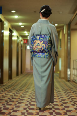 先日の「大人のきものおしゃれ辞典出版記念パーティー」の写真がoteshioに届きました。さすが、プロのカメラマンさんですね。私の後ろ姿ですが、こんなに奇麗に撮れています(笑)なかなか出番のない龍の帯を江戸小紋に締めてみました。髪には、山崎航さんの羽根のブローチを付けて、この羽根は、帯留めにも髪飾りにもなるのです。